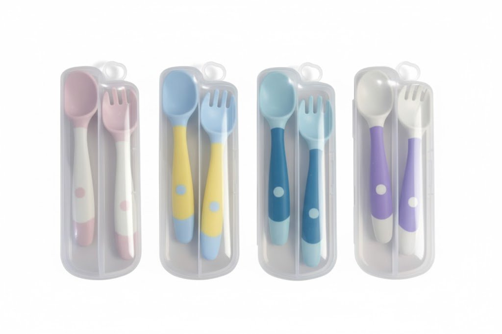 حافظة صحية ومحمولة: كل زوج من الملعقة والشوكة يأتي في حافظة بلاستيكية شفافة صلبة. هذه الحافظات تحافظ على نظافة الأدوات قبل وبعد الاستخدام، مما يجعلها مثالية لحملها في حقيبة اليد أو حقيبة الحفاضات أثناء التنقل والسفر.